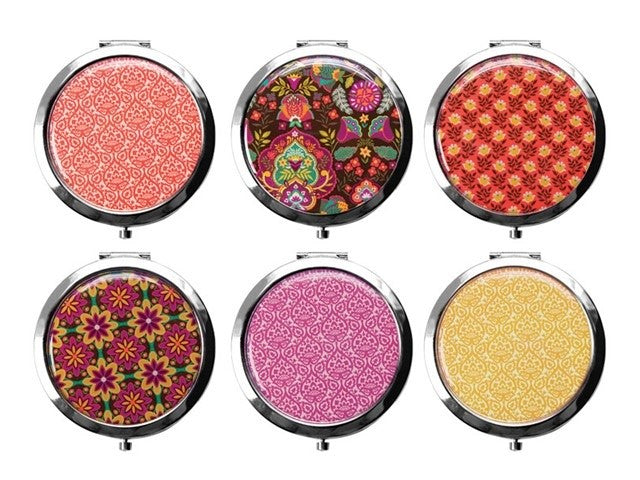 Keep your look flawless anywhere with this charming, compact makeup mirror. It slides easily into a pocket or purse and features an array of beautiful, assorted Boho designs within its own elegant case. Assorted shapes; round, square, and heart shaped. Ideal for gift giving!